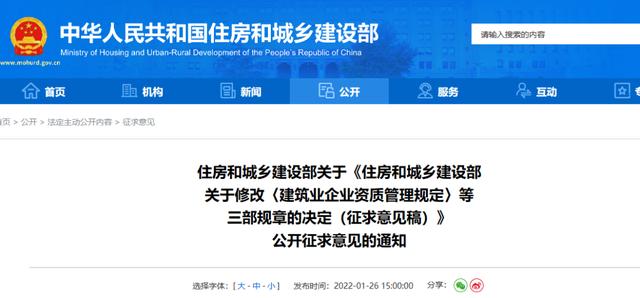 為落實建設(shè)工程企業(yè)資質(zhì)管理制度改革要求,住房和城鄉(xiāng)建設(shè)部擬修改《建筑業(yè)企業(yè)資質(zhì)管理規(guī)定》《工程監(jiān)理企業(yè)資質(zhì)管理規(guī)定》《建設(shè)工程勘察設(shè)計資質(zhì)管理規(guī)定》,起草了《住房和城鄉(xiāng)建設(shè)部關(guān)于修改〈建筑業(yè)企業(yè)資質(zhì)管理規(guī)定〉等三部規(guī)章的決定(征求意見稿)》,現(xiàn)向社會公開征求意見。公眾可通過以下途徑和方式提出反饋意見: