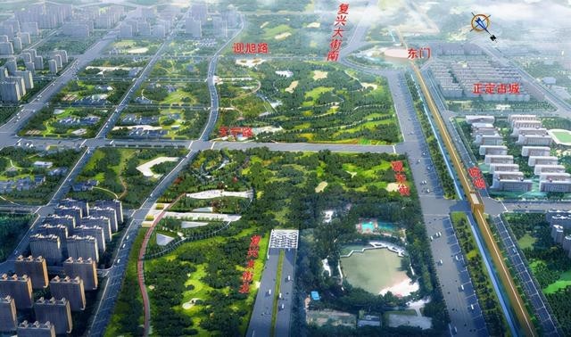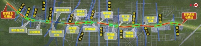 復(fù)興大街市政化改造工程,本次改造按照設(shè)計(jì)速度100公里/小時、雙向8車道城市快速路標(biāo)準(zhǔn)進(jìn)行設(shè)計(jì)建設(shè),標(biāo)準(zhǔn)路基寬度34.5米。全線新建大橋13座,總長4436米,其中滹沱河景觀特大橋2300米,泊水公園景觀大橋605米;新建地下隧道3座,總長5.02公里,其中正定古城段隧道2.51公里,白佛隧道1.23公里,學(xué)苑路隧道1.28公里;全線共設(shè)置互通立交11座(改造現(xiàn)有互通立交3座、新建互通立交4座、預(yù)留互通立交4座),增設(shè)出入口匝道16對(預(yù)留1對)。同時,結(jié)合區(qū)域交通需求,在滹沱河北大堤至月牙路段與和平路至南二環(huán)段局部增設(shè)輔路系統(tǒng),輔路總長約5.3公里,按照設(shè)計(jì)速度50公里/小時、雙向四車道的城市主干路標(biāo)準(zhǔn)建設(shè),兩側(cè)設(shè)置人非慢行系統(tǒng)。