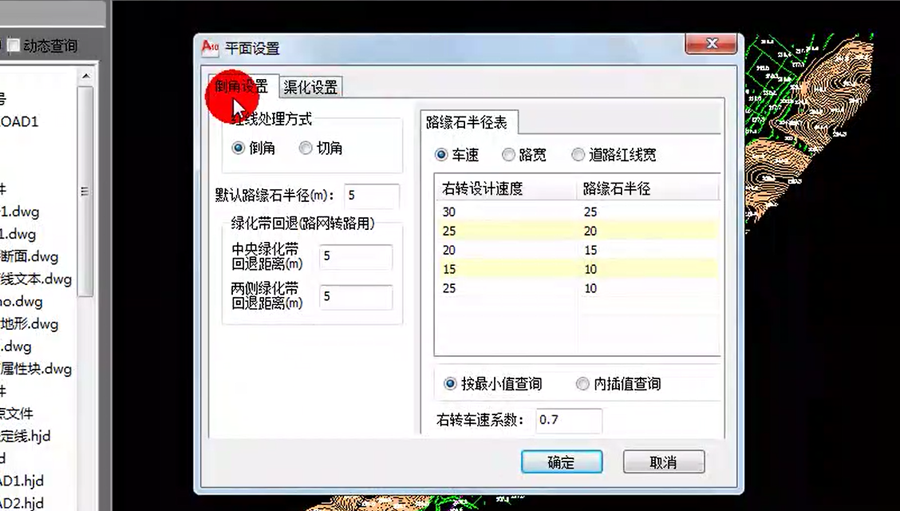 1)路緣石半徑表有車速、路寬、道路紅線寬。車速是針對不同的右轉設計速度對于不同的路緣石半徑,輸入右轉車速系數(shù)“0.7”。