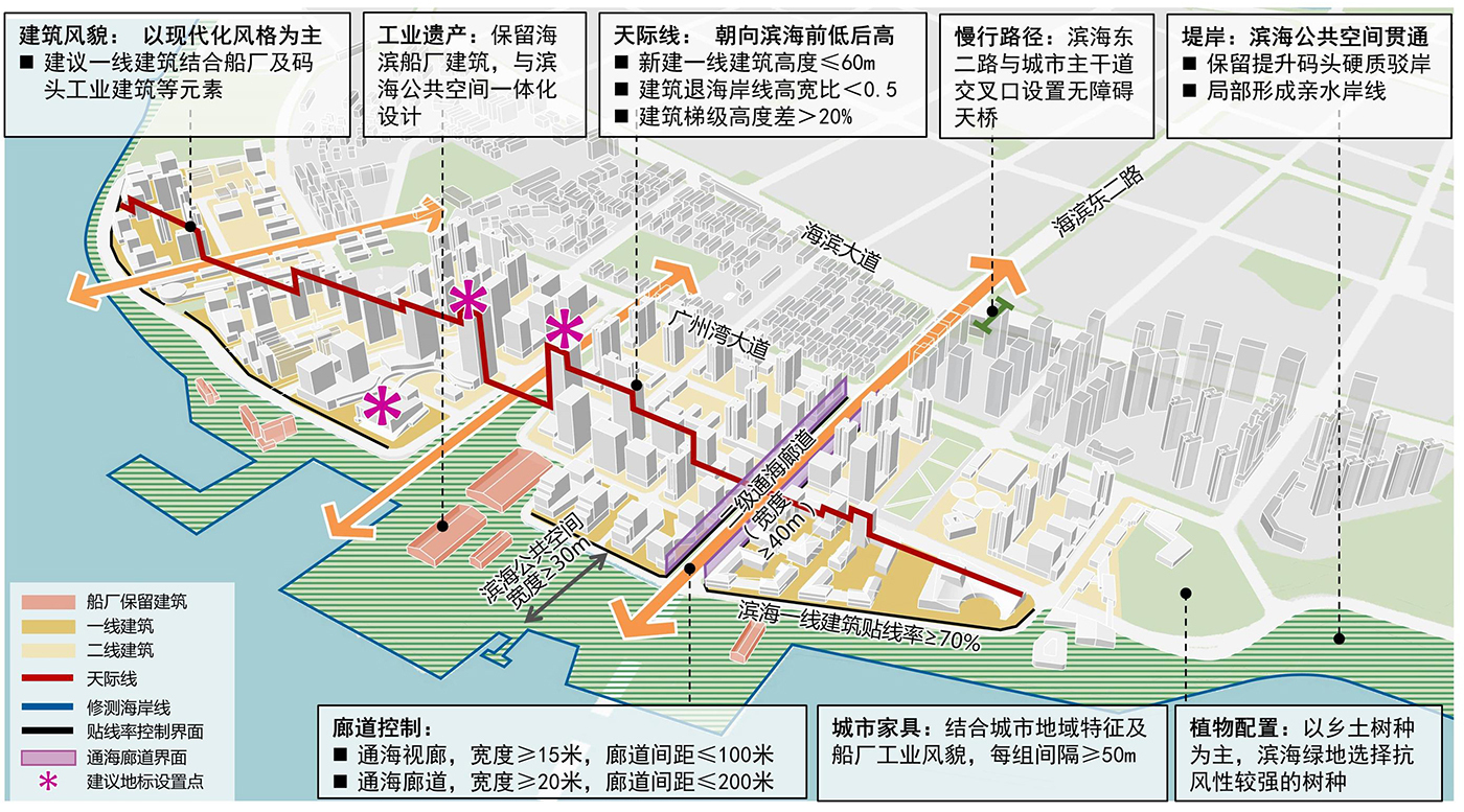 管控要點:結(jié)合船廠工業(yè)遺產(chǎn),垂直海岸線控制多條通海廊道??刂菩陆ㄒ痪€建筑高度≤60m,建筑退海岸線高寬比<0.5,建筑梯級高度差> 20%,形成由濱海向內(nèi)陸前低后高的天際線。