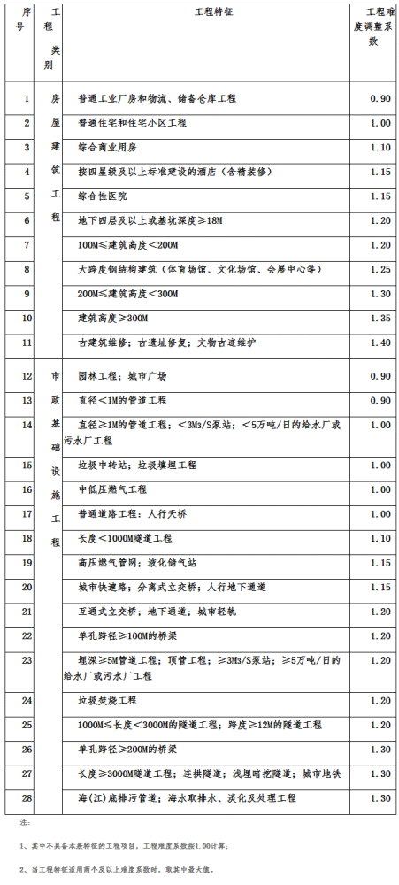 工程復雜程度分為一般、較復雜和復雜三個等級,其調(diào)整系數(shù)分別為:一般(Ⅰ級)0.85;較復雜(Ⅱ級)1.0;復雜(Ⅲ級)1.15。