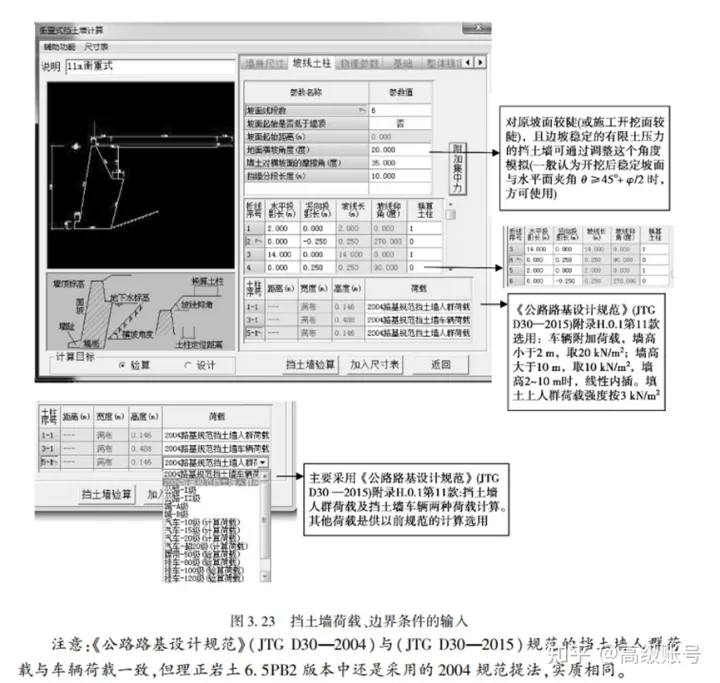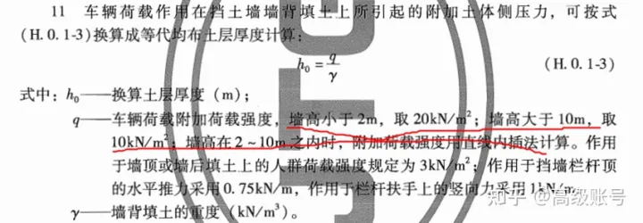 對于擋土墻的結構設計和驗算,在《公路路基設計規(guī)范》(JTG D30-2015)的附錄H里對行車荷載如何考慮是有規(guī)定的,H.0.1的11條,核心思路也是將車輛荷載換算為對應土柱高度,但是相較穩(wěn)定計算則考慮的更為簡單,它的車輛荷載附加荷載強度值是給定的,10~20kPa,按照規(guī)定取就行了。