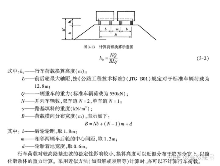 在《公路路基設計規(guī)范》(JTG D30-2015)中沒有發(fā)現對邊坡穩(wěn)定計算時行車荷載如何考慮的條文,但是在《路基路面工程》(黃曉明版)和《公路軟土地基路堤設計與施工技術細則》(JTG/T D31-02-2013)中有相關表述?!豆奋浲恋鼗返淘O計與施工技術細則》4.1.4-4.1.6條的規(guī)定如下,即將行車荷載換算成土柱高度,可按車輛荷載均布于車輛投影面積上換算得出。