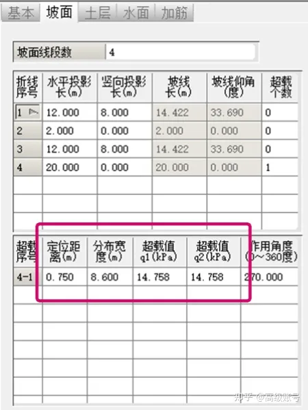 那么是不是直接勾選單列車隊或雙列車隊就可以了呢,如果單向有四個車道呢,分布四列車是不是更偏向不穩(wěn)定?因此,建個簡單粗糙的模型對比一下。在理正邊坡中建了個高度16m的路堤,其余條件保持一致,只有施加的超載位置、分布寬度和強度值不同。