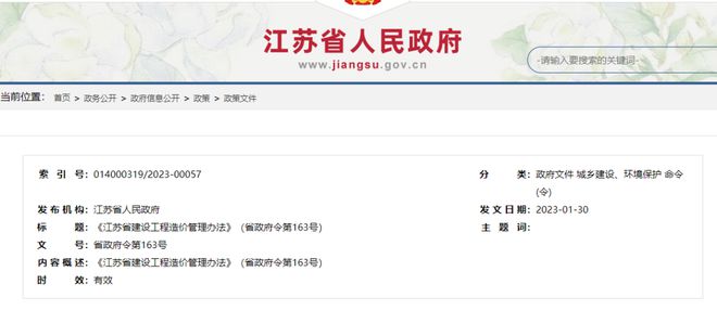江蘇省人民政府令第 163 號《江蘇省建設(shè)工程造價管理辦法》已于2023年1月27日經(jīng)省人民政府第1次常務(wù)會議討論通過,現(xiàn)予公布,自2023年4月1日起施行。