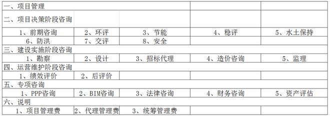 PPP項(xiàng)目主要咨詢服務(wù)內(nèi)容包括:項(xiàng)目建議書、可行性研究報(bào)告,初步實(shí)施方案、物有所值評(píng)價(jià)報(bào)告、財(cái)政承受能力論證報(bào)告、實(shí)施方案,PPP項(xiàng)目合同咨詢、項(xiàng)目招標(biāo)采購(gòu)代理、中期評(píng)估、建設(shè)期或運(yùn)營(yíng)期績(jī)效考核細(xì)化服務(wù)方案,建議參照項(xiàng)目投資規(guī)模進(jìn)行收費(fèi),具體如下: