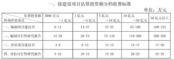 投資決策咨詢包括編制項(xiàng)目建議書、編制可行性研究報(bào)告、評(píng)估項(xiàng)目建議書、評(píng)估可行性研究報(bào)告等,取費(fèi)可參考《國(guó)家計(jì)委關(guān)于印發(fā)建設(shè)項(xiàng)目前期工作咨詢收費(fèi)暫行規(guī)定的通知》(計(jì)價(jià)格〔1999〕1283號(hào)),該文件提出了投資額在3000萬(wàn)元以上的建設(shè)項(xiàng)目前期工作咨詢收費(fèi)標(biāo)準(zhǔn),而投資額3000萬(wàn)元以下的建設(shè)項(xiàng)目由各省自行制定,如湖北省制定了相應(yīng)的地方標(biāo)準(zhǔn)——《省物價(jià)局關(guān)于制定估算投資額3000萬(wàn)元以下建設(shè)項(xiàng)目前期工作咨詢收費(fèi)標(biāo)準(zhǔn)的通知》(鄂價(jià)房服〔2001〕107號(hào)),具體收費(fèi)標(biāo)準(zhǔn)根據(jù)估算投資額在收費(fèi)標(biāo)準(zhǔn)相對(duì)應(yīng)的區(qū)間內(nèi)用插入法計(jì)算。