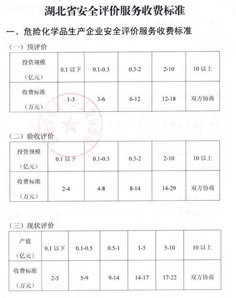 安全評(píng)價(jià)可參考地方收費(fèi)標(biāo)準(zhǔn),如湖北省地方收費(fèi)標(biāo)準(zhǔn)——《省物價(jià)局 省安全生產(chǎn)監(jiān)督管理局關(guān)于安全評(píng)價(jià)服務(wù)收費(fèi)有關(guān)問題的通知》(鄂價(jià)工服〔2016〕56號(hào)),具體如下: