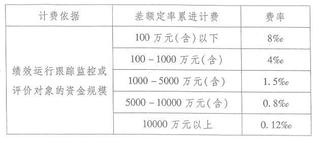 全咨單位參與預(yù)算績(jī)效管理服務(wù)取費(fèi)可參考地方收費(fèi)標(biāo)準(zhǔn),如湖北省地方標(biāo)準(zhǔn)——《湖北省財(cái)政廳關(guān)于印發(fā)<湖北省第三方機(jī)構(gòu)參與預(yù)算績(jī)效管理工作暫行辦法>的通知》(鄂財(cái)績(jī)規(guī)〔2014〕3號(hào)),績(jī)效運(yùn)行跟蹤監(jiān)控和績(jī)效評(píng)價(jià)全部委托服務(wù)采用計(jì)件收費(fèi)方式的,以績(jī)效運(yùn)行跟蹤監(jiān)控或評(píng)價(jià)對(duì)象的資金規(guī)模為計(jì)費(fèi)依據(jù)。