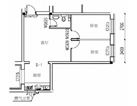 在室內(nèi)鋪設(shè)燃氣管線時,必須注意:①不能鋪設(shè)在潮濕或含有腐蝕性介質(zhì)的房間,也不能將其引入臥室,特別是在臥室、浴室或衛(wèi)生間里;②嚴禁通過易燃、爆炸物品、配電間、變電所、煙、風(fēng)道等場所;③橫穿臥房、衛(wèi)生間或地下室的管道,應(yīng)在套管內(nèi)安裝焊接;④如需放置于潮濕或有腐蝕性介質(zhì)的室內(nèi),則應(yīng)采用防腐蝕措施;⑤管道穿越樓板、樓梯平臺、墻壁、隔墻時,應(yīng)將管線置于套管內(nèi)。⑥安裝燃氣灶的房間凈高不宜低于2.2米,安裝熱水器的房間應(yīng)該宜大于2.4米。如圖3所示,室內(nèi)廚房豎管的設(shè)計。
