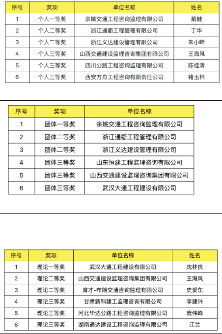 競(jìng)賽現(xiàn)場(chǎng)賽程緊湊,氣氛緊張,選手靈活運(yùn)用自己的經(jīng)驗(yàn)和技能,尋找現(xiàn)場(chǎng)存在的質(zhì)量安全問(wèn)題。經(jīng)過(guò)一天的激烈角逐,裁判組綜合研判,評(píng)定出個(gè)人、團(tuán)體、理論獎(jiǎng)項(xiàng)如下圖,另有60名選手獲得優(yōu)勝獎(jiǎng),其中浙江選手包攬個(gè)人和團(tuán)體前三名。