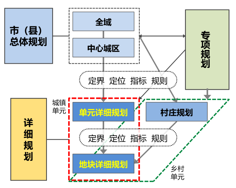 (一)重構(gòu)“中心城區(qū)—單元—地塊”傳導(dǎo)層級(jí)。針對(duì)原控規(guī)承接傳導(dǎo)體系不健全情況,依據(jù)國土空間總體規(guī)劃,立足城鎮(zhèn)開發(fā)邊界和中心城區(qū)關(guān)系,重構(gòu)“全域空間—中心城區(qū)—單元—地塊”多層級(jí)、全覆蓋的傳導(dǎo)體系。明確單元作為市、縣國土空間總體規(guī)劃向詳細(xì)規(guī)劃傳導(dǎo)規(guī)劃內(nèi)容和要求的空間載體,是詳細(xì)規(guī)劃編制、管理、實(shí)施和監(jiān)督的基本單位,在國土空間總體規(guī)劃階段劃定。地塊則是詳細(xì)規(guī)劃管理和項(xiàng)目實(shí)施單位。