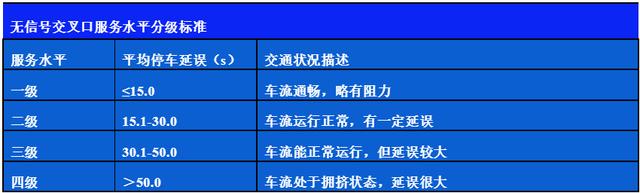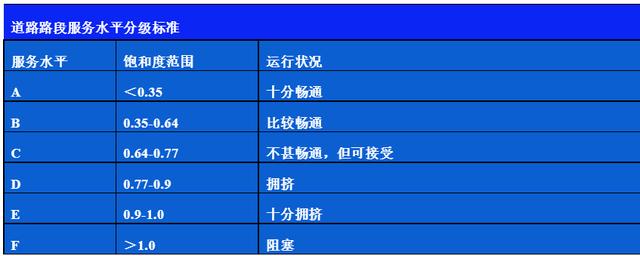 建設(shè)工程影響范圍內(nèi)道路路段、交叉口是否產(chǎn)生新的交通瓶頸點,是否造成路段局部或交叉口某個流向交通狀況惡化,是否能夠維持道路路段或交叉口服務(wù)水平處于合理范圍。以服務(wù)水平分級作為主要評價內(nèi)容,以延誤或飽和度為基本評價指標(biāo),也可采用排隊長度等指標(biāo)。