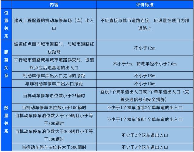 建設(shè)工程出入口與機動車停車場(庫)出入口評價主要內(nèi)容及標(biāo)準如下。