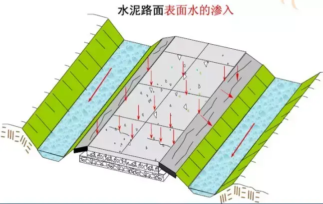 路面結構內部水的危害:浸濕各結構層材料和路基土,易造成無粘結粒狀材料和地基土的強度降低;使水泥混凝土路面產生唧泥,隨之出現(xiàn)錯臺、開裂和整個路肩破壞;進入空隙的自由水在行車荷載的作用下,會形成高孔隙水壓力和高流速的水流,引起路面基層的細顆粒產生唧泥,結果失去支承;在冰凍深度大于路面厚度的地方,高地下水位會造成凍脹,并在凍融期間降低承載能力;水使凍脹土產生不均勻凍脹;與水經常接觸將使瀝青混合料剝落,影響瀝青混凝土耐久性和產生龜裂。