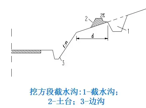 2.截水溝:又稱天溝,一般設置在挖方路基邊坡坡頂以外,或山坡路堤上方的適當?shù)攸c,用以攔截并排除路基上方流向路基的地面徑流。
