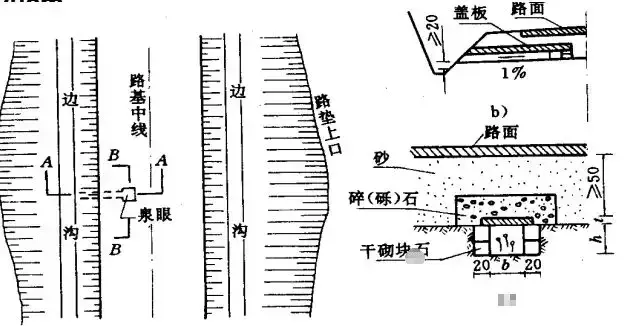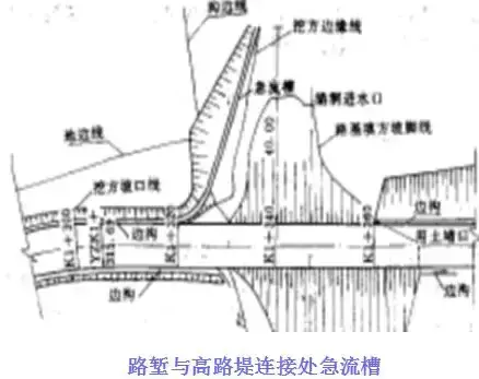 1.邊溝:邊溝用于匯集和排除降落在路基范圍內以及流向路基的少量地表水。邊溝設置在挖方路基的路肩外側或低路堤的坡腳外側,多與路中線平行,用以匯集和排除路基范圍內流向路基的少量地面水。