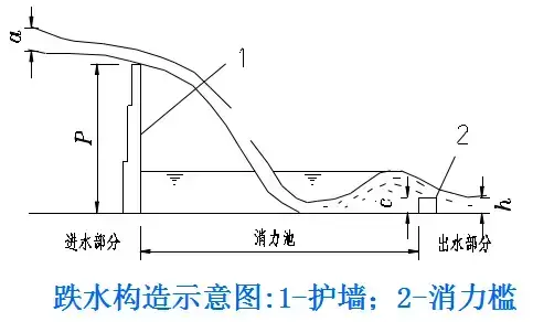 跌水構造:單級和多級之分,溝底有等寬與變寬之別?;緲嬙炜煞譃檫M水口、消力池和出水口三個部分。