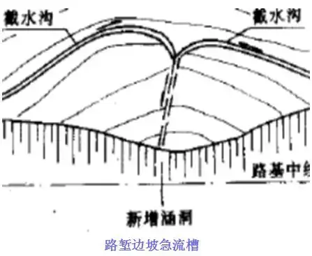 急流槽設置通常設置在高路堤邊坡、高路塹邊坡、路塹與高路堤連接處、回頭曲線上下邊溝等位置,是山區(qū)公路溝通上下線路路基排水及溝渠出水口的一種常見排水設施。