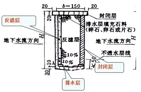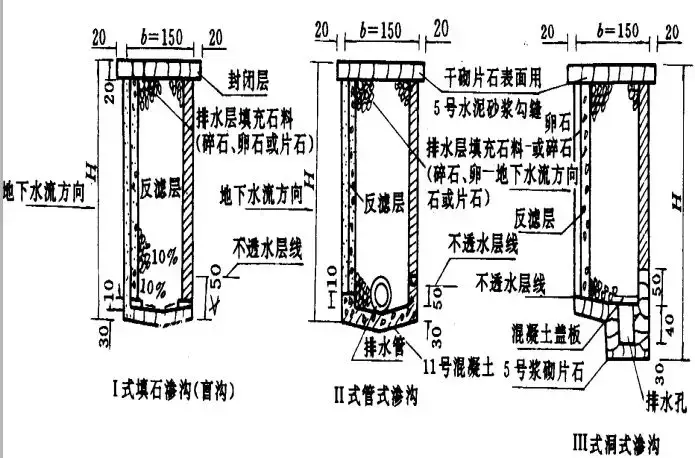 滲溝構造:由排水層(石縫,管,洞),反濾層和封閉層所組成。封閉層:防止地面水的下滲(漿砌片石)。反濾層:匯集水流,防止水層中的土粒堵塞排水層,由大小均勻的砂石材料,分層填埋。