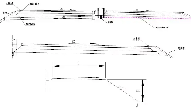 (2)縱坡與長度:截水溝的縱坡不宜小于0.3%,長度的考慮以匯水既不造成過大的沖刷,又不淤積為原則。