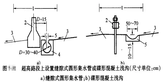 (1)寬度小于3m且表面采用鋪面封閉的中央分隔帶排水,降落在分隔帶上的表面水排向兩側行車道,其坡度與路面的橫坡度相同;在超高路段上,可在分隔帶上側邊緣處設置緣石或泄水口,或者在分隔帶內設置縫隙式圓形集水管或碟形混凝土淺溝和泄水口,以攔截和排泄上側半幅路面的表面水。緣石過水斷面的泄水口可采用開口式,格柵式或組合式;碟形混凝土淺溝的泄水口采用格柵式。