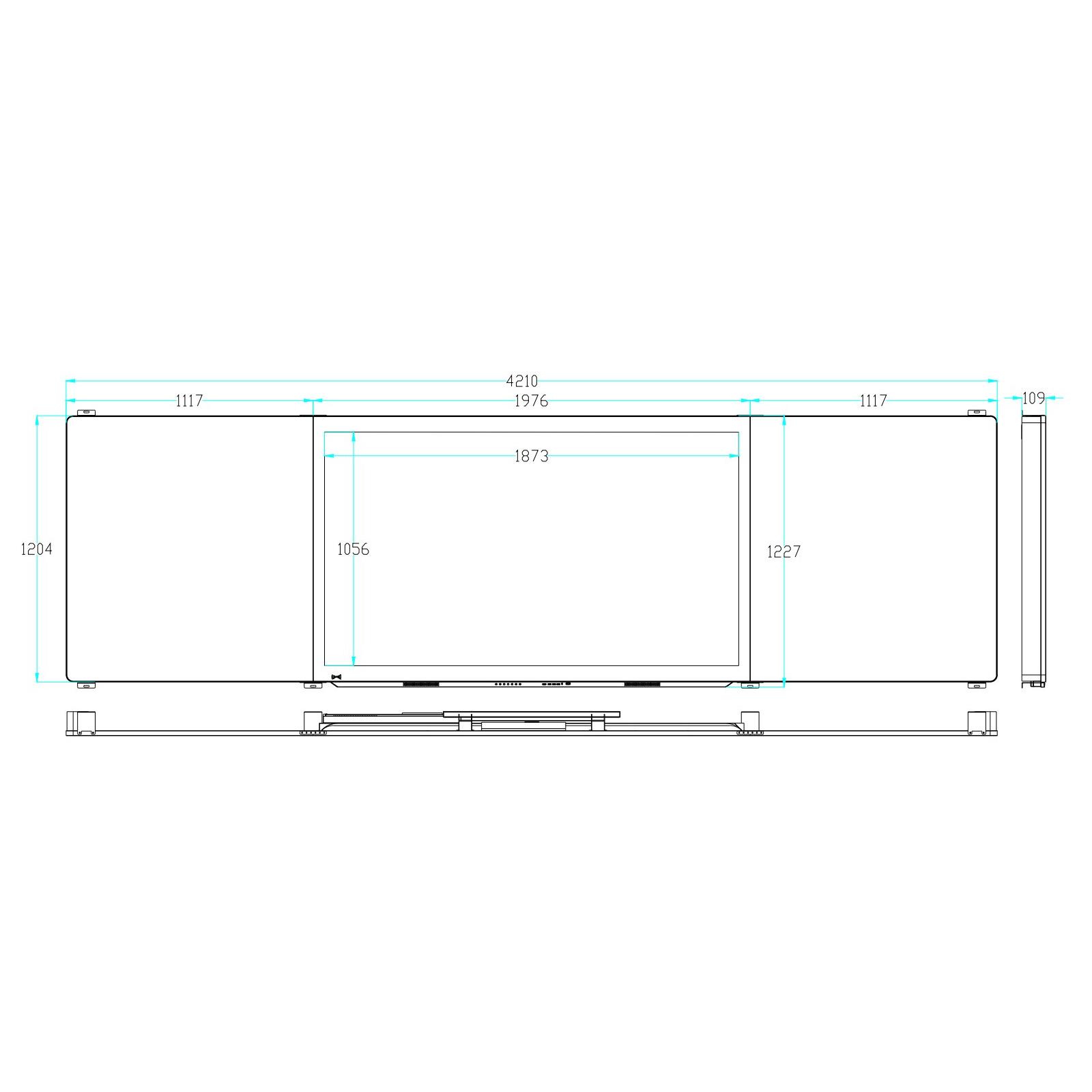 3、 整機(jī)尺寸:長(zhǎng)≥4200mm、高≥1200mm、厚≦110mm,中間區(qū)域屏幕采用86英寸 LED 液晶屏,顯示比例16:9,具備防眩光效果。