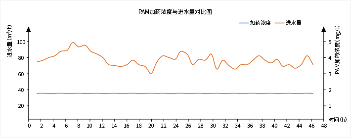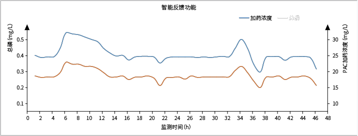 消除由于進(jìn)水不穩(wěn)定造成的出水 SS 波動(dòng),削峰效果明顯,使出水 SS 穩(wěn)定達(dá)標(biāo),而且在進(jìn)水 SS 較低時(shí),可以自動(dòng)降低藥劑投加量或者間斷性加藥,極大地節(jié)省藥劑投加量。智能加藥系統(tǒng)穩(wěn)定可靠、精準(zhǔn)控制,為用戶降低管理成本及提升經(jīng)濟(jì)效益,具有廣闊的應(yīng)用前景。